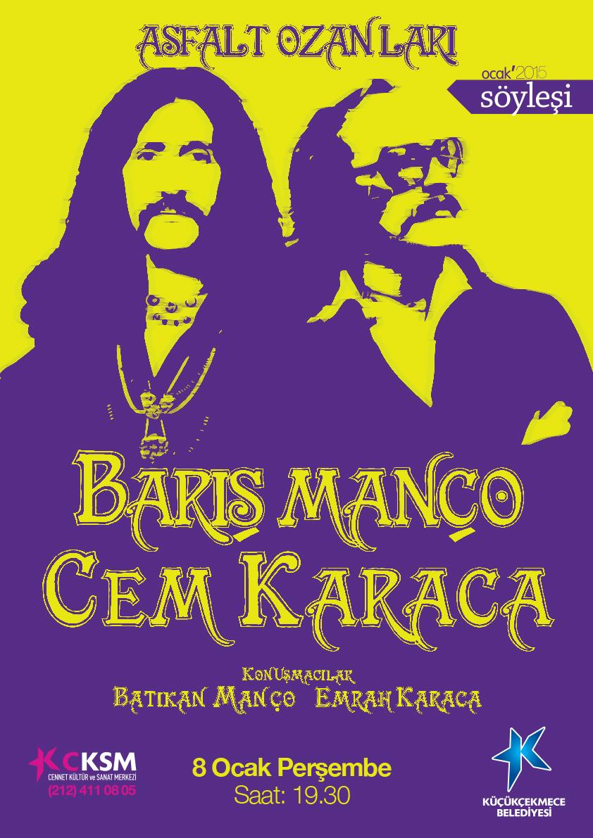 İstanbul Küçükçekme`de bulunan kültür merkezinde Semih Çelik`in moderatörlüğünde Cem Karaca ve Barış Manço anılacak. Söyleşi havasında geçecek etkinlikte Emrah Karaca ve Batıkan Manço anılarından bahsedecek, bilinmeyenleri açıklayacak. Cennet Kültür Merkezi`nin resmi sayfasında etkinliğin açıklaması şöyle verilmiş: